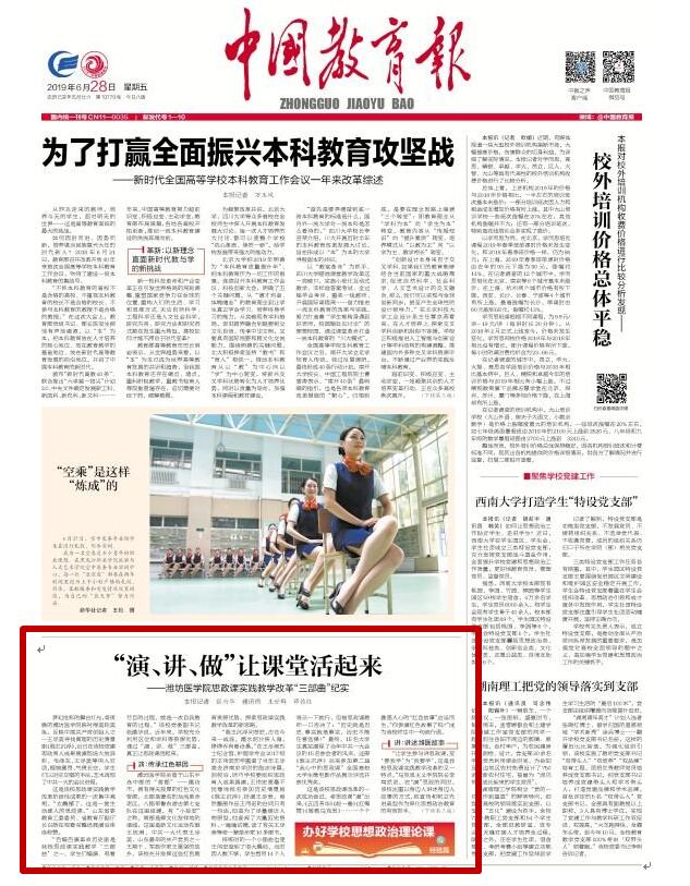 6月28 日,《中国教育报》头版以《“演、讲、做”: 让课堂活起来——潍坊医学院思政课实践教学改革“三部曲”纪实》(通讯员:王世群、谭德红)为题,专题报道了腐漫画 思政课实践教学改革的特色与经验。