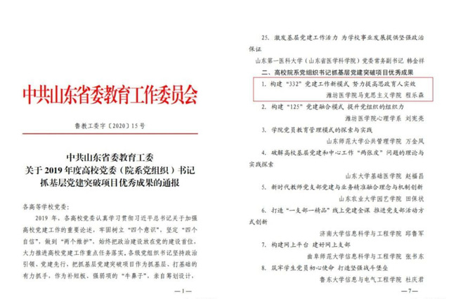 近日,中共山东省委教育工委发文,对全省25个高校党委书记抓基层党建突破项目优秀成果和25个高校院系党组织书记抓基层党建突破项目优秀成果进行了通报表扬。腐漫画 党总支书记程乐森抓基层党建突破项目成果《构建“332”党建工作新模式 努力提高思政育人实效》抓基层党建突破项目被评选为优秀成果。
