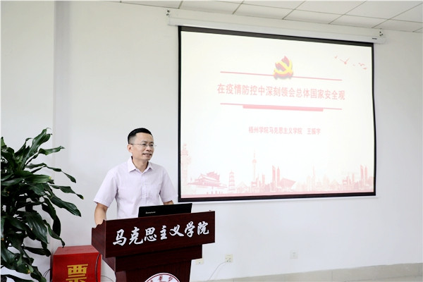 王振宇以《在疫情防控中深刻领会总体国家安全观》为主题,从总体国家安全观的提出、总体国家安全观的内容、国家安全体系的构成、维护国家安全及时既是国家责任也是公民责任这四方面展开,结合目前多国防控新冠肺炎疫情的形势,理论联系实际,深入浅出的讲清了国家安全的重要性、紧迫性以及人人参与维护国家安全的必要性。