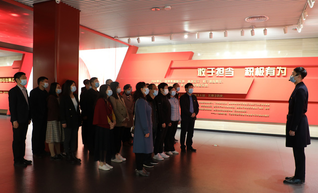 在展厅,面向中国共产党党旗,党总支副书记、院长李笃武带领全体教师一起重温入党誓词。随后在讲解员的引领下,全体教师踏着潍坊百年以来的历史足迹,重温了潍坊“中华人民共和国成立前艰苦卓绝的革命历史”“中华人民共和国成立初期热火朝天的建设历史”“开放后勇闯新路的改革历史”“新时代长风破浪的奋斗历程”,认识了潍坊发展百年的跌宕历史和辉煌成就。真实的图片、珍贵的文献、感人的视频,深刻揭示了不同的历史时期,潍坊各级党组织和党员干部的为民情怀和担当精神,彰显了“不忘初心、牢记使命”的时代意义。