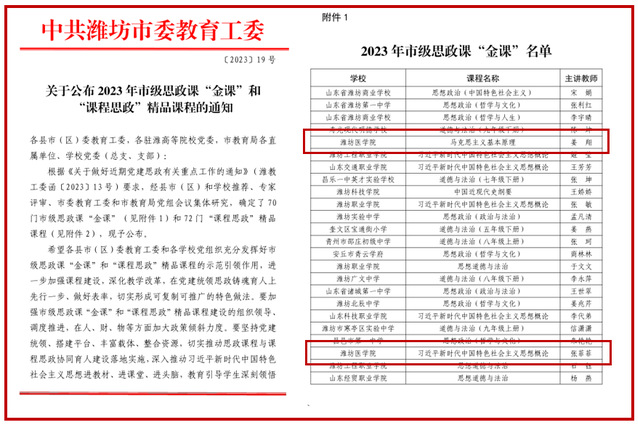 近日,中共潍坊市委教育工委公布了2023年市级思政课“金课”和“课程思政”精品课程名单,腐漫画 姜翔老师主持的《马克思主义基本原理》,张菲菲老师主持的《习近平新时代中国特色社会主义思想概论》课程成功获批市级思政课“金课”。