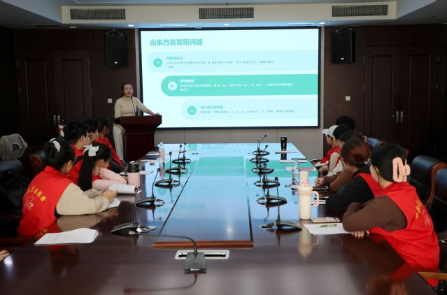 本次研学实践为第一期,以“听、走、讲”三段式进阶路径为核心脉络,层层递进锤炼大学生“理响”宣讲团学生的党史素养与宣讲能力。在专业赋能阶段,潍坊市党史教育馆金牌讲解员围绕普通话标准发音、气息科学控制、情感精准表达等基础技能开展系统培训,通过示范讲解、一对一指导、情景模拟等方式,让学生们深刻领悟“用声音传递历史温度、用语言诠释精神力量”的宣讲真谛。沉浸式研学环节中,学生们跟随讲解员的脚步,在潍坊市党史教育馆的一幅幅珍贵图片、一件件革命文物、一个个复原场景前驻足沉思,在沉浸式体验中真切感受潍坊大地孕育的红色基因,深刻理解红色精神的丰富内涵与时代价值。随后,学生们在党史馆的真实场景中开展实战演练,以饱满的热情、生动的语言讲述“潍县战役”的英勇壮烈、“红色热土”的时代变迁,将所学所悟转化为宣讲实效。金牌讲解员老师现场点评、即时纠错,针对宣讲逻辑、情感表达、互动技巧等方面提出优化建议。